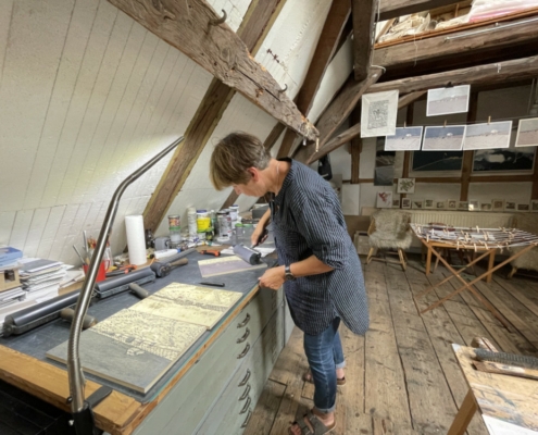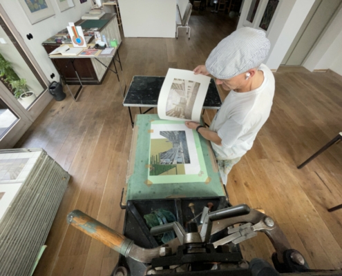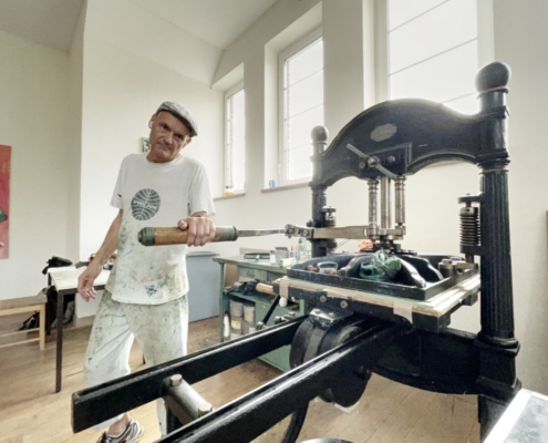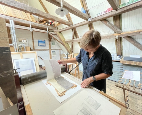 Arbeitsfoto von der Herstellung der Edition „Hommage an die Grafik“ im Graphischen Atelier von Katja Zwirnmann
